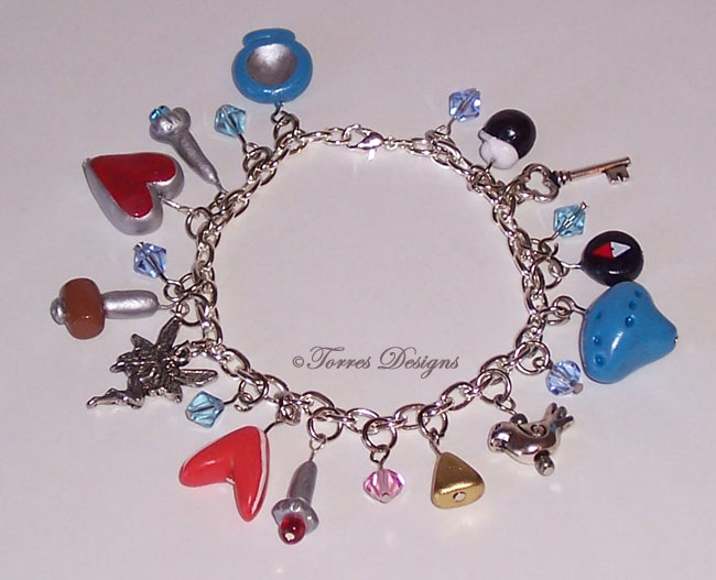 Bracelet consists of 20 Charms: 1. Ocarina, 2. Boomerang, 3. Small Bomb, 4. Triforce Piece, 5. Magic Mirror, 6. Compass, 7. Hammer, 8. Fire Rod, 9. Ice Rod, 10. Key, 11. Fairy, 12. Cucco, 13. Heart Container, 14. Light Pink Swarovski element to represent Zelda encased in crystal, 15-20. 3 Dark and 3 Light Blue Swarovski elements to represent the maidens encased in crystal.